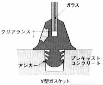 Y形ガスケット構法は,コンクリート・石などのU字形溝に,Y形の構造ガスケットを介してガラスをはめ込む構法です.