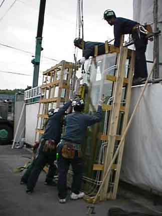 吸盤機にて硝子を吸着し、吊上げ作業の準備を行っています。。