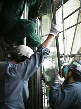 ガラスを持ち上げ、ガラスの一辺をサッシ枠の一方に
