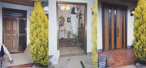 枚方市樟葉西山丸尾 ○○邸 改装用断熱ドア リネスタ木目調45親子 定価\473,800-(オプション別) カバー工法 AM9:00〜PM12:30(3時間半) 2002年2月9日 下記@〜B参照 |