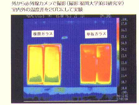 向かって右側は単板ガラスのため、室内の熱が外に逃げており、ガラス面の温度 が高くなっている。左側は熱が逃げていない。この場合、ガラスよりアルミサッシからの失 熱が多い。